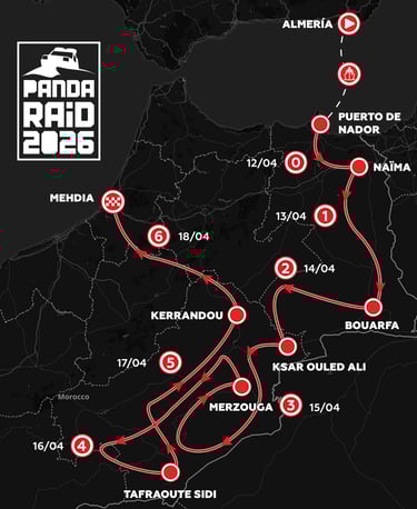 Almeria es el punto de encuentro de todos los equipos participantes. Ahí se realizan las verificaciones de los coches y se parte en ferri hasta el puerto de Nador, donde inicia la aventura. 6 etapas hasta Medha, final de la aventura.